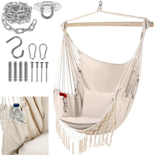 СТУЛ HAMAK, БРАЗИЛЬСКИЙ БЕЖЕВЫЙВЫСОЧАЙШИЙ КОМФОРТ И БЕЗОПАСНОСТЬ — сидіння крісла МАЛАТЕК просто величезне! Цілих 120х150 см, таке велике сидіння дасть вам відпочити даремно в саду, на терасі, балконі або в номері. Крім того, максимальне навантаження становить 150 кг, що забезпечить вам максимальний комфорт і безпеку.НАТУРАЛЬНІ МАТЕРІАЛИ + 2 ПОДУШКИ- Матеріал забезпечує належну вентиляцію, що зберігає комфорт використання підвісного крісла навіть у спекотні дні. Додатково ми додали в гойдалку дві дуже зручні подушки.ЦЕПЬ 2 МЕТРА міцне металеве монтажне колесо з'єднане міцними тросами, рівномірно розподіленими за шириною гамака через дерев'яну перекладину. Завдяки такій конструкції його легко повісити, а гамак добре збалансований і стабільний. Додатковою перевагою є дуже довгий ланцюг для збирання, довжина до 2 метрів для підвішування, тому ви можете повісити гамак навіть на високу гілку.ДОРІВ'ЯНА ПЕРЕКЛАДКА — завдяки тому, що гамак має дерев'яну перекладину, він дає змогу прийняти зручну позу під час відпочинку. Ви можете вільно читати та спостерігати за довкіллям. Він ідеально підійде для стаціонарного встановлення в саду, на терасі або в кімнаті.СПЕЦИФІКАЦІЯ — колір: бежевий; матеріал: тканина/дерево/метал; максимальне навантаження: 150 кг; довжина наголів'я 100 см; довжина ланцюга: 2 м; розміри подушки: 45х45 см; розміри після навішування 150х100 см; розміри сидіння: 120х150 см; вага: 4480 кг; вага в пакованні: 4.498 кг.